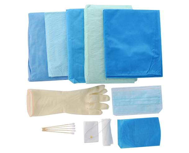 由护理垫、医用单、洞巾、医用外科口罩、手术衣、帽子、袖套、腿套、纱布块、棉球、棉签、橡胶外科手套、脐带卷、托盘、缝线、吸痰管、脐带扎、橡皮管组成。包内配件主要由非织造布、医用脱脂纱布、医用脱脂棉、聚丙烯或聚乙烯制成,经环氧乙烷灭菌,产品无菌。