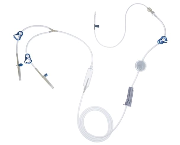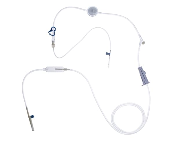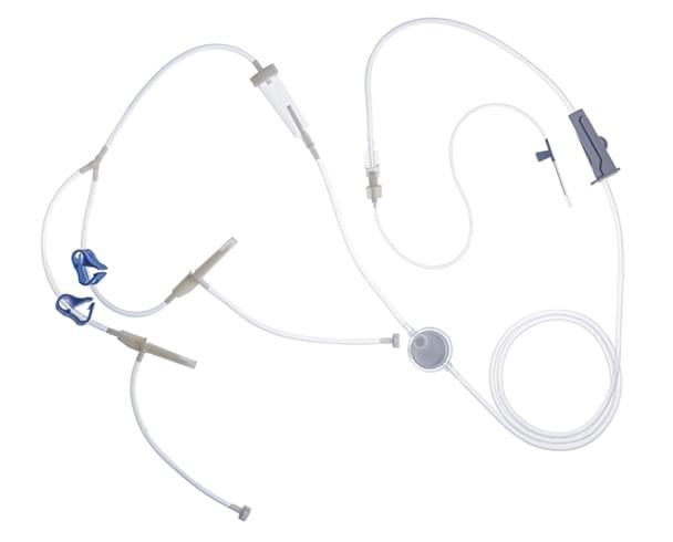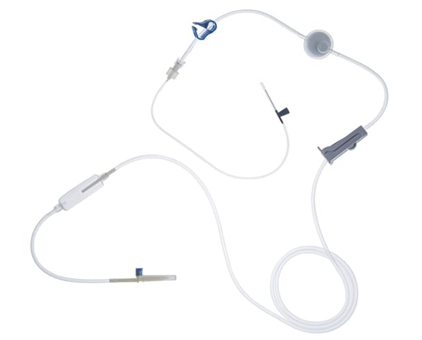 由瓶塞穿刺器保护套、瓶塞穿刺器、进气器件、开关、接头、软管、滴斗、滴管、流量调节器、 精密药液过滤器(2µm、3µm、5µm)、注射件、外圆锥接头、静脉输液针和输液贴(不含药物)组成。 管路采用聚丙烯热塑性弹性体(TPE)材料。 环氧乙烷灭菌、无菌、无热原、一次性使用。