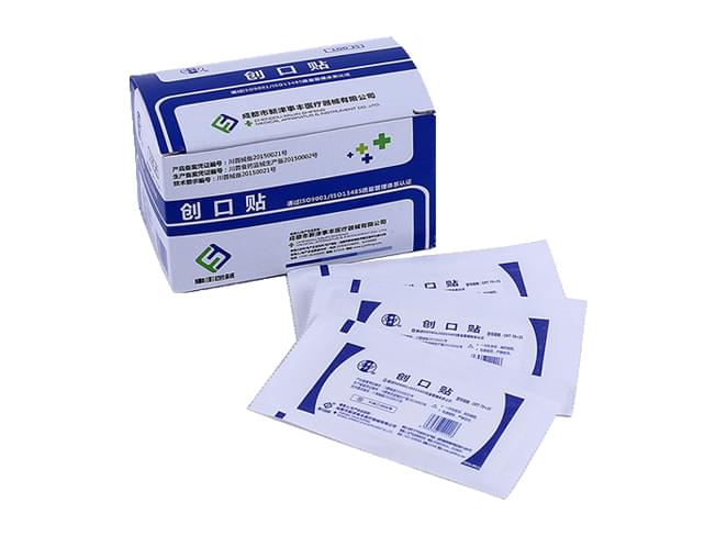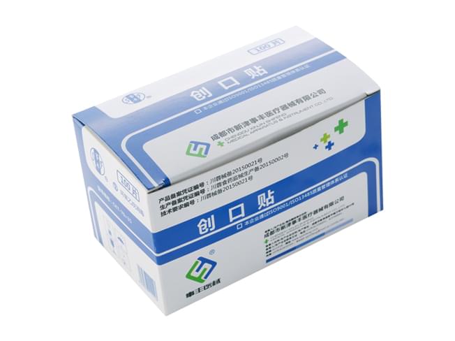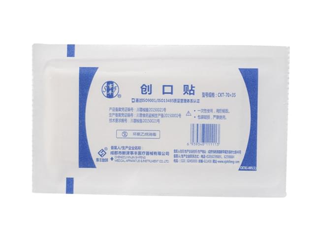 产品主要采作非织造布制成,由胶带、离型纸、吸水垫组成;底质为打孔、脱敏纸胶布。环氧乙烷灭菌,一次性使用。
